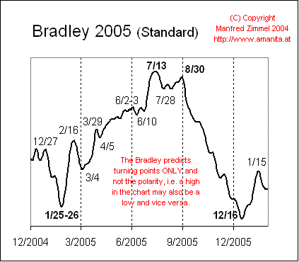 E’ bene ricordare, quando si esaminano questi grafici, che spesso noi entriamo in ciò che viene chiamato “Inversione”, dove i prezzi si muovono in senso opposto a quello di Bradley. La direzione del siderografo di Bradley non è importante quanto le effettive DATE DI SVOLTA del siderografo. Sapremo se ci troviamo in un periodo di inversione quando i prezzi aumentano costantemente mentre l’indice Bradley sta costantemente diminuendo, comunque la data di svolta del Bradley sarà ancora significativa per il rialzo dei titoli e dovrebbe rappresentare almeno un picco di breve durata una volta che l’indice Bradley tocca il fondo e svolta.