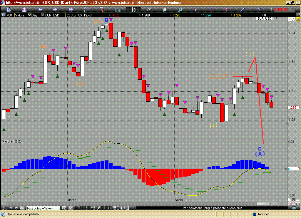 After (April 11-15) wave b decline, the euro is on its way up toward 1.3120-1.3135 in wave c of a bearish expanded flat corrective wave (ii) rally.)....  ora sembra avere spazio per scendere vedremo domani sara' molto importante la conferma del segnale sul macd...